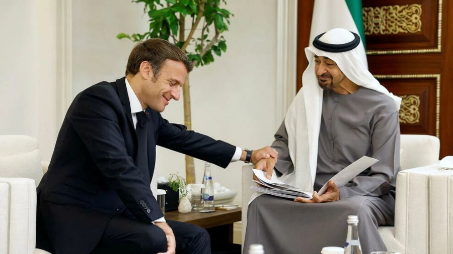 والتقى رئيس دولة الإمارات محمد بن زايد، الرئيس الفرنسي إيمانويل ماكرون. وقدّم ماكرون الذي أعيد انتخابه هذا الشهر، تعازيه لمحمد بن زايد، قبل أن يعقدا جلسة مباحثات مغلقة.