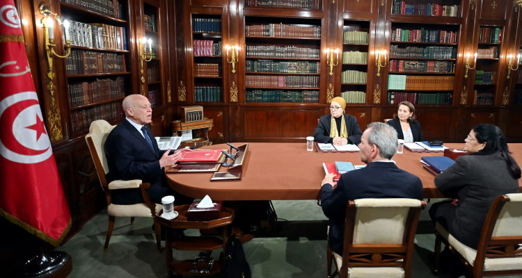 أشرف رئيس الجمهورية قيس سعيّد، عصر اليوم الخميس 1 فيفري 2024 بقصر قرطاج، على جلسة عمل ضمّت كلا من  أحمد الحشّاني، رئيس الحكومة، و ليلى جفّال، وزيرة العدل، وسهام البوغديري نمصية، وزيرة المالية، وفاطمة ثابت شيبوب، وزيرة الصناعة والمناجم والطاقة.