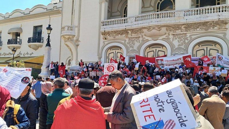 نفّذ عدد من أنصار مسار 25 جويلية اليوم الخميس 1 ماي 2025، وقفة في شارع الحبيب بورقيبة بالعاصمة رفضا لأي تدخل أجنبي في الشأن الداخلي لتونس.