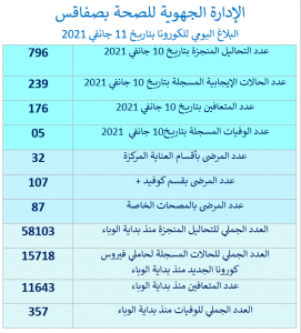 أعلنت الإدارة الجهوية للصحة بصفاقس اليوم الإثنين 11 جانفي 2021, عن تسجيل 5 حالات وفاة جديدة بفيروس كورونا بتاريخ أمس الاحد 10 جانفي, كما تم تسجيل 239 إصابة جديدة بالوباء.