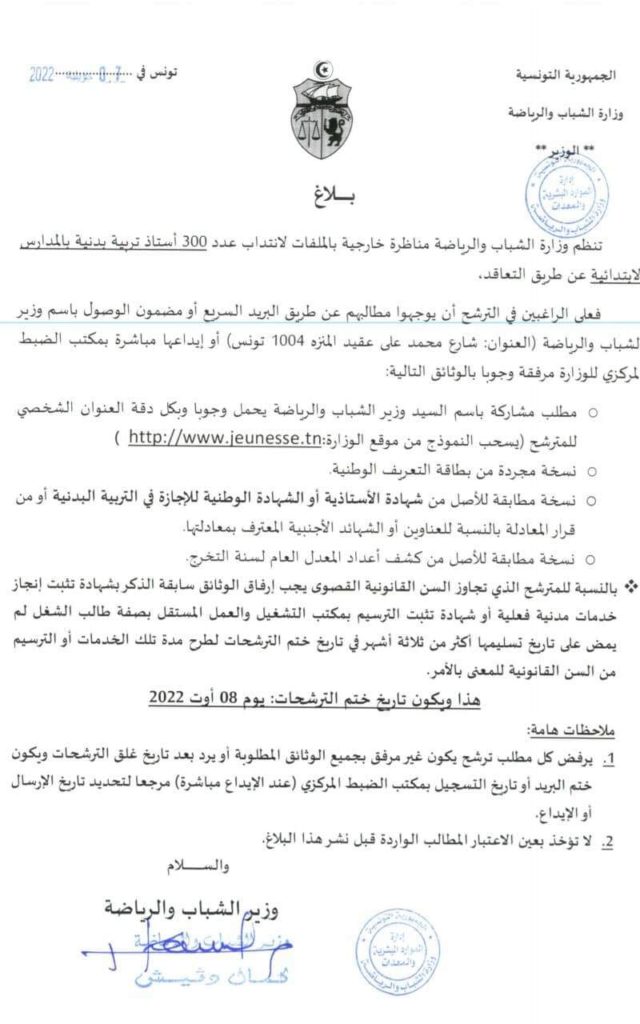 أخبار وطنية فتح مناظرة لإنتداب 300 أستاذ تربية بدنية بالمدارس الإبتدائية عن طريق التعاقد. By Jfara-Fm Posted on July 10, 2022 0 second read 0 0 785 Share on Facebook Share on Twitter Share on Google+ Share on Reddit Share on Pinterest Share on Linkedin Share on Tumblr