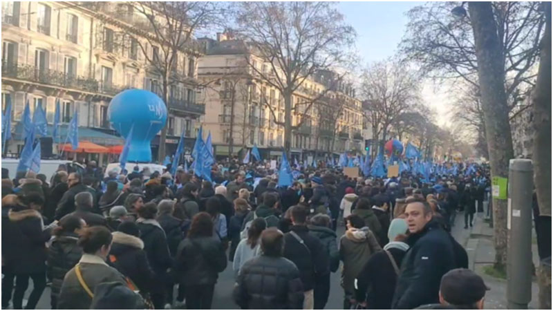 وخرج مئات آلاف الأشخاص في عموم مدن فرنسا السبت في يوم رابع من الاحتجاجات والمظاهرات ضد مشروع القانون الذي تقدمت به الحكومة لتعديل نظام التقاعد ومن أهم بنوده رفع سن الإحالة على المعاش إلى 64 عاما.
