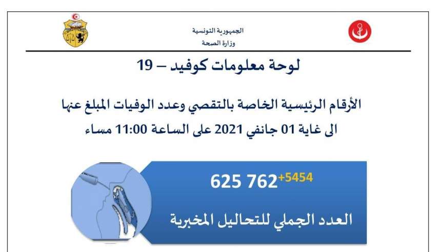 أخبار وطنية فيروس كورونا بتونس : تسجيل 35 وفاة و 1422 اصابة جديدة خلال يوم امس. By Jfara-Fm Posted on January 2, 2021 0 second read 0 0 537 Share on Facebook Share on Twitter Share on Google+ Share on Reddit Share on Pinterest Share on Linkedin Share on Tumblr