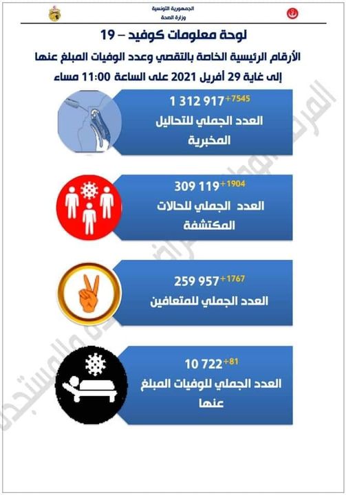 أخبار وطنية فيروس كورونا بتونس : تسجيل 81 وفاة و 1904 إصابة جديدة. By Jfara-Fm Posted on April 30, 2021 0 second read 0 0 464 Share on Facebook Share on Twitter Share on Google+ Share on Reddit Share on Pinterest Share on Linkedin Share on Tumblr