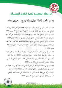 قرر مكتب الرابطة الوطنية لكرة القدم المحترفة خلال اجتماعه اليوم الثلاثاء 11 فيفري 2020 معاقبة الملعب التونسي بتوبيخ وخطية مالية قدرها 3000 د من أجل العود في إشعال الشماريخ دون رميها إثر نهاية المقابلة التي جمعت الفريق بالنادي الإفريقي يوم 9 فيفري 2020.