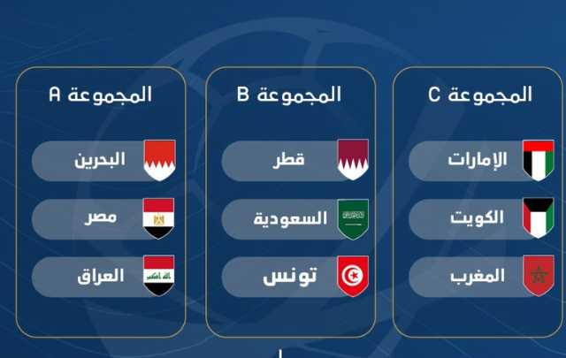 وضمت المجموعة الاولى منتخبات البحرين ومصر والعراق بينما تالفت المجموعة الثالثة من منتخبات الامارات والكويت والمغرب.