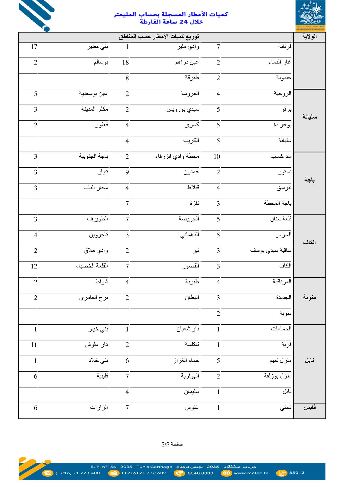 سجلت العديد من جهات الجمهورية خلال الـ24 ساعة المنقضية، نزول كميات متفاوتة من الأمطار تراوحت بين 1 مم في عدة مناطق ووصلت إلى 18 مم في سجنان من ولاية بنزرت وعين دراهم من ولاية جندوبة