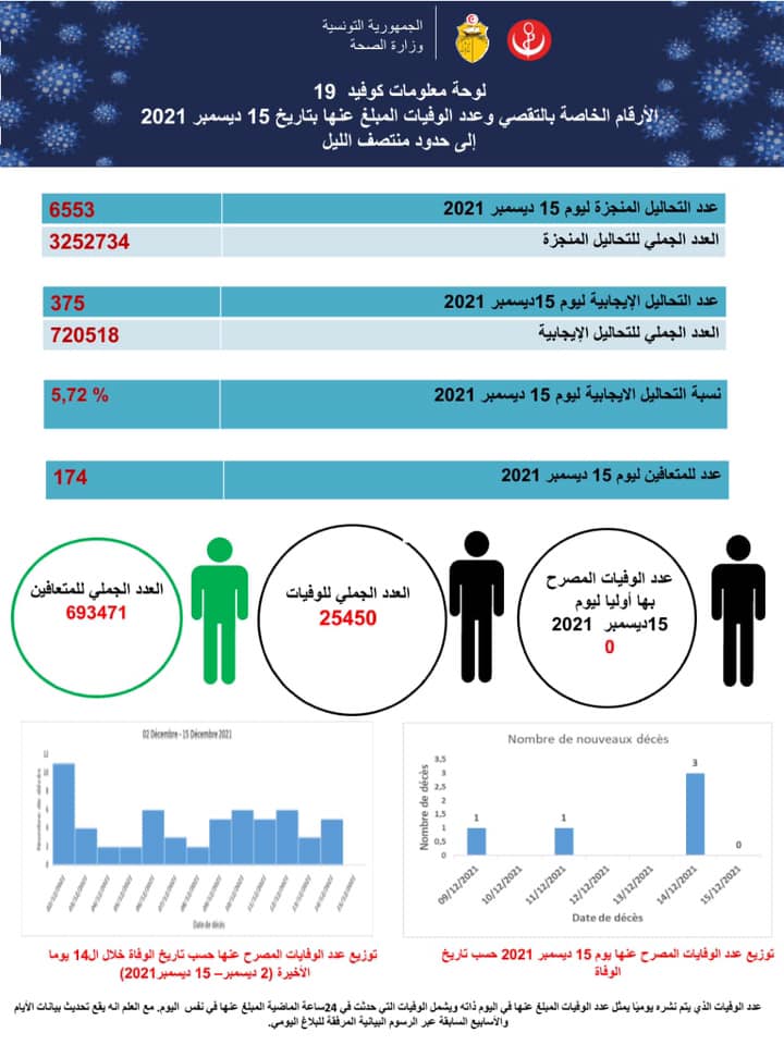 أعلنت وزارة الصحة مساء اليوم الخميس 16 ديسمبر 2021، عن تسجيل 375 إصابة جديدة بفيروس كورونا من جملة 6553 عينة تم رفعها للتحليل أمس 15 ديسمبر، لتكون بذلك نسبة التحاليل الإيجابية 5،72 بالمائة.