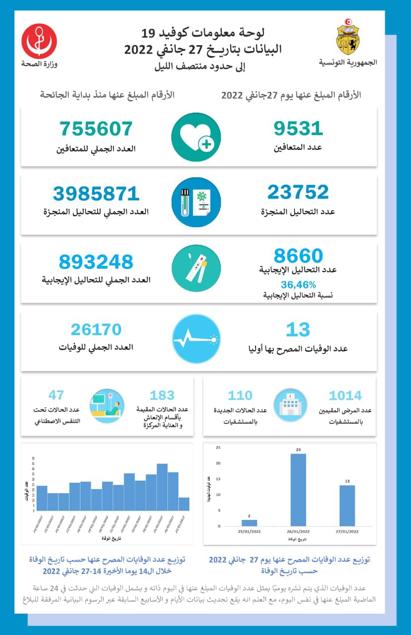 أعلنت وزارة الصحة في بلاغ لها اليوم السبت، أنه تم بتاريخ يوم 27 حانفي 2022، تسجيل 13 حالة وفاة من المبلّغ عنها بفيروس كورونا لتصل عدد حالات الوفاة إلى 26170 حالة.