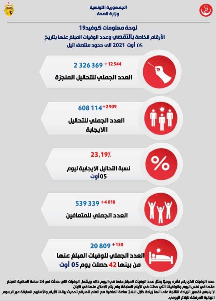 سجّلت وزارة الصحة إلى غاية يوم الخميس 5 أوت ، 130 حالة وفاة جراء فيروس كورونا و2909 إصابة جديدة بالفيروس من جملة 12544 تحليلا مخبريا.