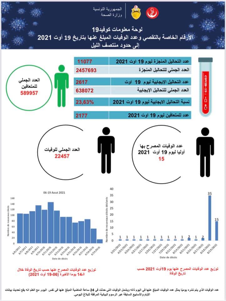 أعلنت وزارة الصحة تسجيل 15 وفاة جديدة بفيروس كورونا بتاريخ 19 أوت 2021.
