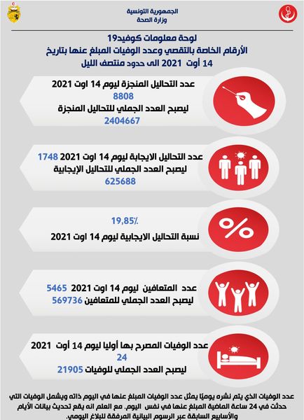 كما أعلنت الوزارة تسجيل 24 وفاة بفيروس كورونا مصرّح بها أوّليا بتاريخ 14 أوت الحالي، ورصدَ 1748 إصابة بعد إجراء أكثر من 8808 تحاليل مخبرية.