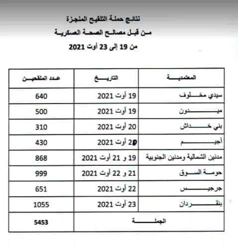 تم تطعيم 5453 مواطن بالجرعة الاولى من اللقاح المضاد لفيروس كورونا خلال حملة تلقيح امنتها فرق الصحة العسكرية بمختلف مناطق ولاية مدنين وتواصلت 5 ايام من 19 الى 23 اوت 2021