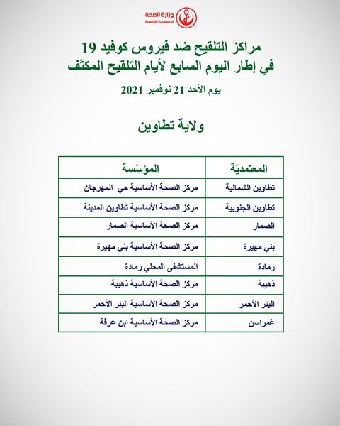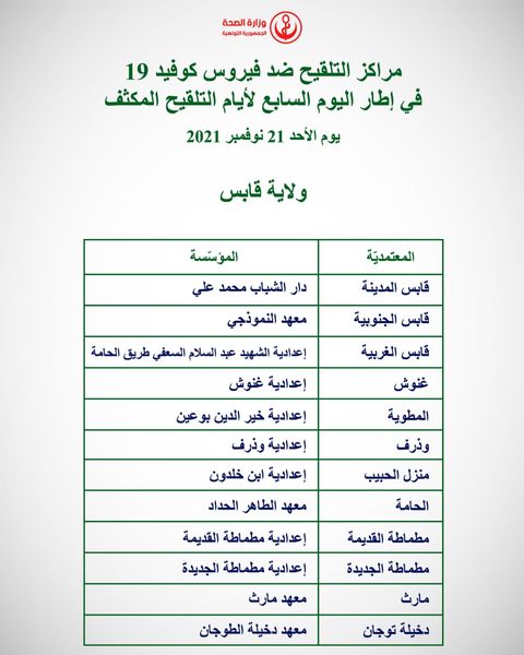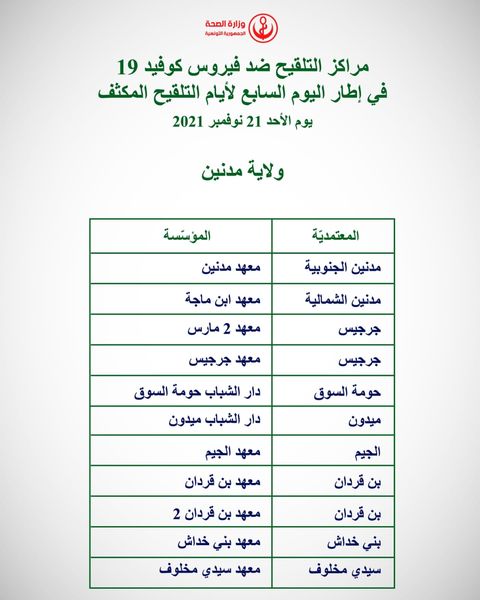 مراكز التلقيح ضد فيروس كوفيد_19 بولايات الجنوب الشرقي الثلاث تطاوين و مدنين و قابس في إطار اليوم السابع لأيام التلقيح المكثف – يوم الأحد 21 نوفمبر 2021 –