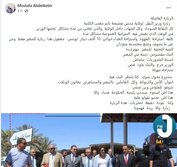 اعتبر الناشط الحقوقي و رئيس المرصد التونسي لحقوق الانسان مصطفى عبد الكبير في تدوينة نشرها صباح اليوم الخميس 16 جوان 2022 على صفحته الرسمية فيسبوك زيارة وزير النقل ربيع المجيدي زيارة فاشلة حسب تعبيره