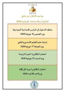 وسيقع يوم السبت 25 جويلية 2020الاعلان عن نتائج الدورة الرئيسية لامتحان الباكالوريا فيما سيعلن عن نتائج دورة المراقبة لامتحان الباكالوريا يوم الأحد 9 أوت 2020 ، حسب وزارة التربية.