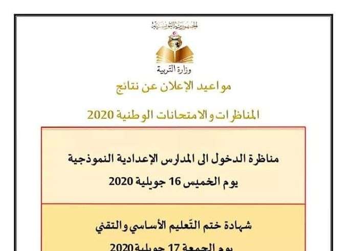 كشفت وزارة التربية عن مواعيد الاعلان عن نتائج المناظرات و الامتحانات الوطنية لسنة 2020 ،حيث سيتم يوم الخميس 16 جويلية الجاري الاعلان عن نتائج مناظرة الدخول الى المدارس الاعدادية النموذجية، فيما سيكون يوم الجمعة 17 جويلية 2020 مواعدا للاعلان عن نتائج شهاة ختم التعليم الأساسي و التقني.