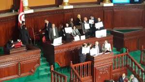 تشهد قاعة الجلسات العامة بالبرلمان منذ صباح اليوم الأحد 8 ديسمبر 2019 حالة من الفوضى خلّفها إعتصام نواب الحزب الدستوري الحر الذين يعيقون السير العادي للجلسة العامة المخصصة لمناقشة مشروع ميزانية الدولة لسنة 2020.