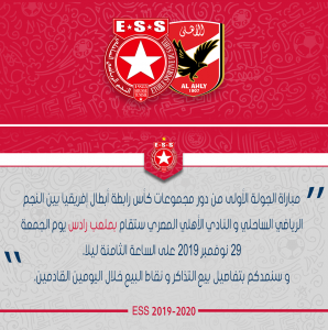 أعلن النجم الرياضي الساحلي عبر صفحته الرسمية بالفايسبوك  أنه تلقى مكتوب رسمي من الاتحاد الافريقي عن موعد مباراة الجولة الاولى من دوري المجموعات التي سيستضيف فيها النادي الأهلي المصري في ملعب اولمبي رادس وسيكون موعدها يوم الجمعة 29 نوفمبر 2019 على الساعة الثامنة ليلا.