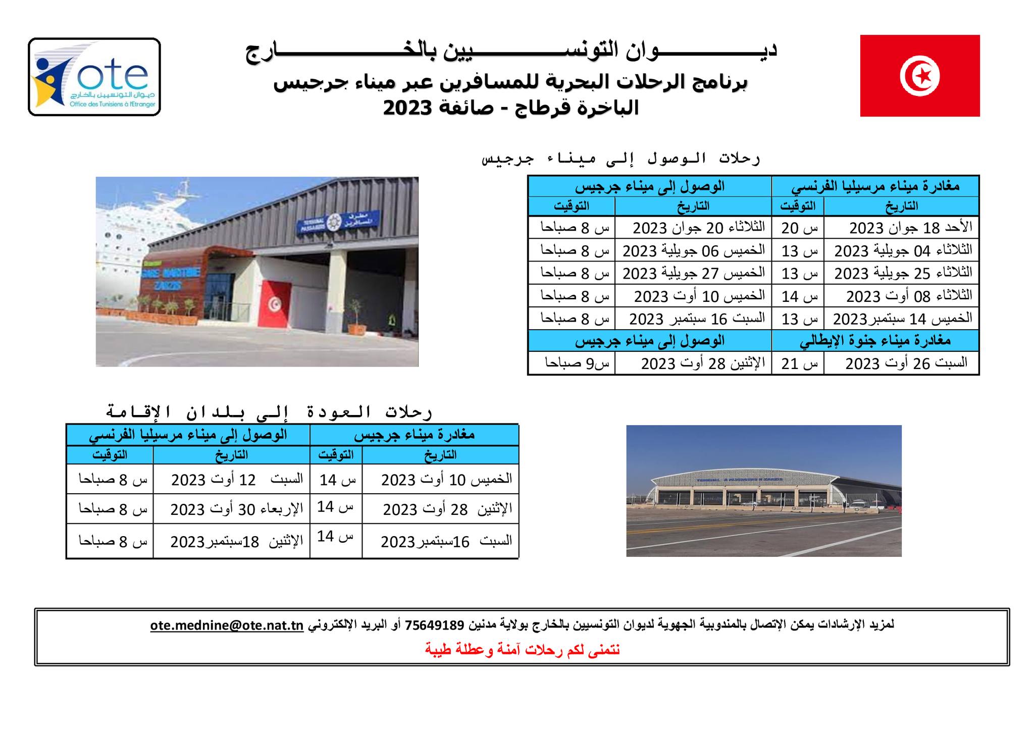 نشر ديوان التونسيين بالخارج برنامج الرحلات البحرية للمسافرين التونسيين بالخارج عبر ميناء جرجيس لصائفة سنة 2023 وصولًا وعودة إلى بلدان إقامتهم.