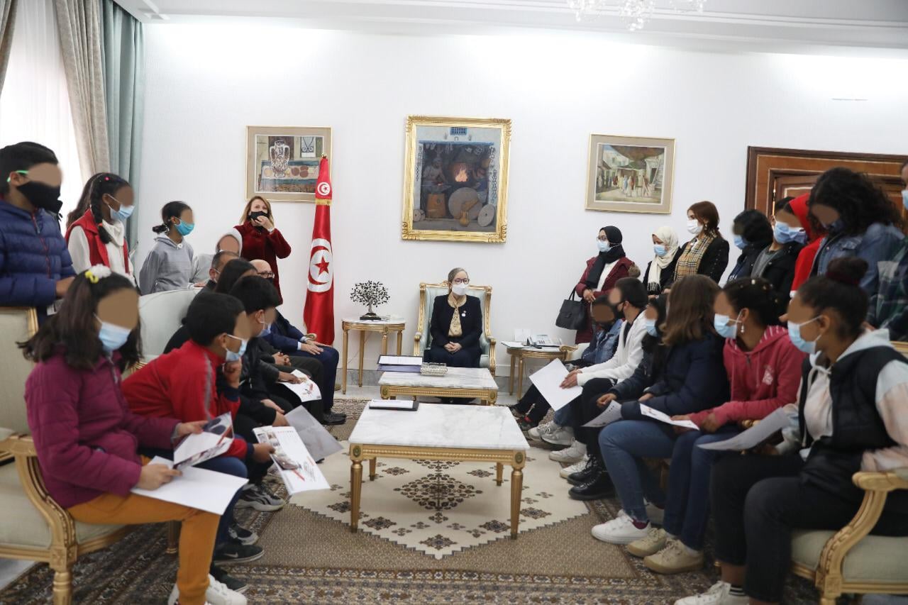 استقبلت رئيسة الحكومة نجلاء بودن رمضان، صباح اليوم السبت، بمكتبها بالقصبة، أطفال المراكز المندمجة للشباب والطفولة من فاقدي السند العائلي وذوي الاحتياجات الخصوصية بكل من مدينتي مرناق وسيدي ثابت وحي الخضراء، وذلك قصد التعرف على قصر رئاسة الحكومة بما يحتويه من مميزات تاريخية ومعمارية وحضارية.