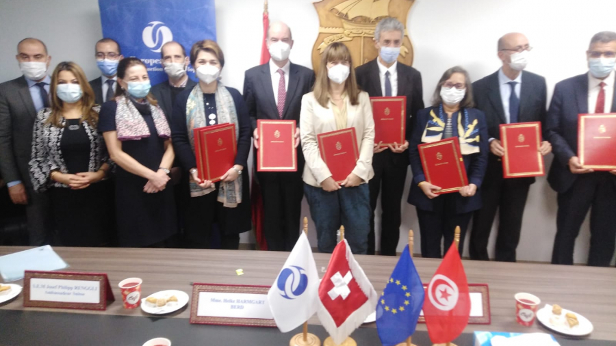 أشرف وزراء، الإقتصاد والتخطيط سمير سعيّد والصناعة والمناجم والطاقة نائلة نويرة ڤونجي والفلاحة والموارد المائية والصيد البحري محمود إلياس حمزة على موكب تمّ خلاله التوقيع على اتفاقيتي هبتين بين الجمهورية التونسية والبنك الأوروبي لإعادة الإعمار والتنمية (BERD).
