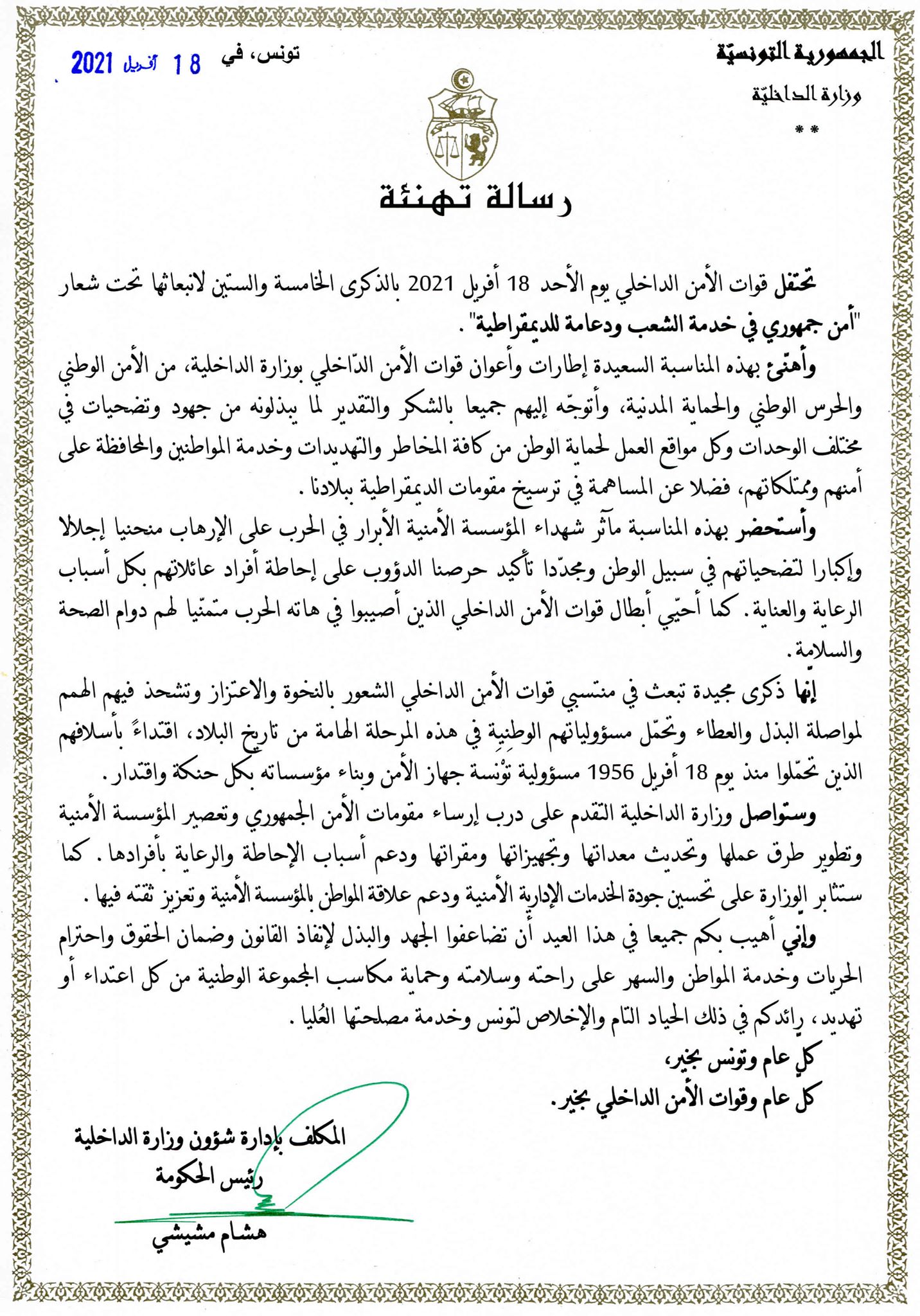 وهنّأ رئيس الحكومة والمكلّف بإدارة شؤون وزارة الداخليّة، هشام المشيشي، إطارات وأعوان قوات الأمن الداخلي بوزارة الداخلية، وتوجّه إليهم بالشكر والتقدير لما يبذلونه من جهود وتضحيات.