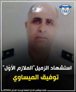 نشرت نقابة موظفي الادارة العامة لوحدات التدخل اليوم الجمعة 6 مارس 2020 استشهاد ملازم أوّل في العملية الارهابية التي جدت بمنطقة البحيرة في محيط سفارة الولايات المتحدة الامريكية وأرفقت النقابة خبرها بصورة للشهيد.