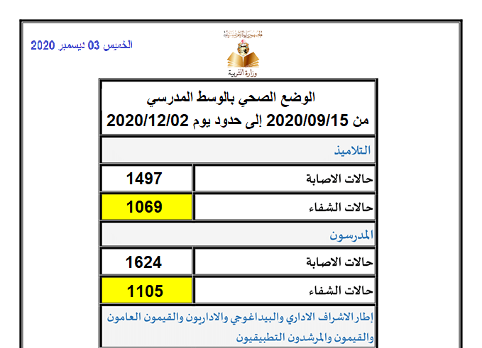 وسجل أكبر عدد من الإصابات في الوسط المدرسي في صفوف المدرسين بـ 1624 إصابة، شفي منهم 1105 مصابا، يليهم التلاميذ بـ 1497 إصابة، شفي منها 1069 تلميذا، فيما بلغ عدد الإصابات في صفوف إطار الإشراف الإداري والبيداغوجي والإداريين والقيمين العامين والقيميين والمرشدين التطبيقيين 319 إصابة، شفي منها 223، وقدر عدد الإصابات في صفوف العملة بـ 89 مصابا، شفي منهم 74 عاملا.