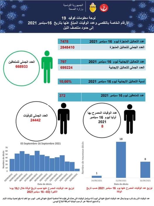 سجلت وزارة الصحة بتاريخ الأربعاء 16 سبتمبر الجاري 8 حالات وفاة جراء الإصابة بفيروس كورونا مصرح بها أوليا و797 إصابة جديدة مؤكدة بكوفيد 19