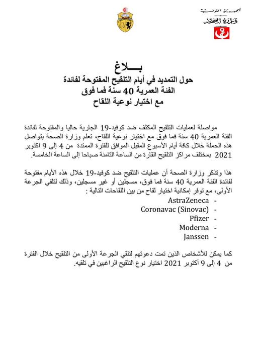 أخبار وطنية وزارة الصحة : تواصل حملة التلقيح المفتوحة لفائدة الفئة العمرية 40 سنة فما فوق مع اختيار نوعية اللقاح كامل الاسبوع القادم من 4 الى 9 اكتوبر 2021 By Jfara-Fm Posted on October 3, 2021 0 second read 0 0 370 Share on Facebook Share on Twitter Share on Google+ Share on Reddit Share on Pinterest Share on Linkedin Share on Tumblr