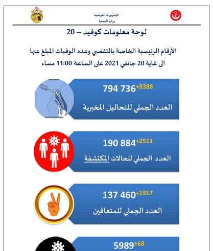 أعلنت وزارة الصحة في بلاغ لها اليوم الخميس 21 جانفي 2021، 2511 إصابة جديدة بفيروس كورونا، و68 وفاة بالفيروس، وذلك وفق الأرقام المسجلة إلى غاية 20 جانفي.