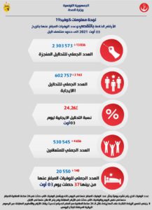 وأوضحت الوزارة في بلاغها المتعلق بالوضع الصحي بالبلاد أمس الأربعاء 4 أوت 2021 أن العدد الجملي للوفيات والإصابات المكتشفة بلغ على التوالي 20550 حالة وفاة و602757 إصابة، منذ ظهور هذا الوباء في تونس بداية مارس الماضي.