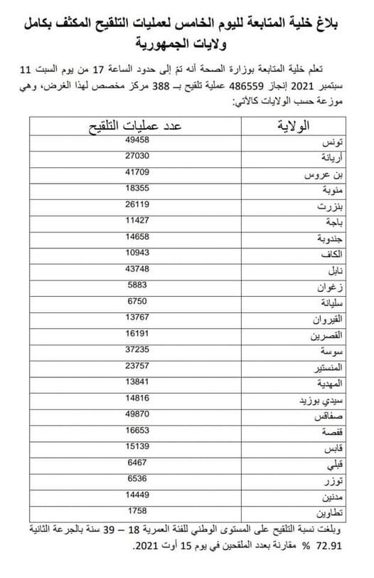 #وزارة_الصحة : تلقيح 428109 شخصا خلال اليوم الوطني الخامس للتلقيح المكثف ضد فيروس كورونا