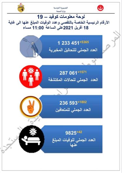 أعلنت وزارة الصحة في بيانها اليوم، عن تسجيل 1571 إصابة جديدة بفيروس كورونا و42 وفاة ، وذلك في الأرقام الرئيسية الخاصة بالتقصي وعدد الوفيات المبلغ عنها إلى غاية 18 أفريل 2021.