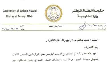 اصدرت اليوم وزارة الخارجية بحكومة الوفاق الوطني الليبية بلاغا اعلنت فيه ان فتح معبر راس الجدير الحدودي سيكون يوم السبت القادم بعد الاتفاق مع الجانب التونسي على صيغة البرتوكول الصحي المعتمد لتسهيل حركة العبور بين البلدين و استئناف الحركة التجارية و حركة المسافرين بالمعابر الجوية و البرية .