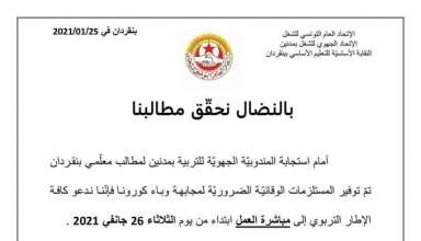 تستأنف غدا الثلاثاء 26 جانفي 2021 الدروس بمدارس بنقردان بعد استجابة المندوبية الجهوية للتربية بمدنين لمطالب المعلمين وتوفير المستلزمات الوقائية