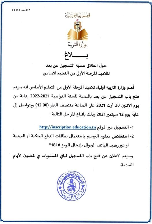 انطلاق عملية التسجيل عن بعد لتلاميذ المرحلة الأولى من التعلبم الأساسي بداية من يوم الإثنين القادم على الموقع : https://inscription.education.tn/