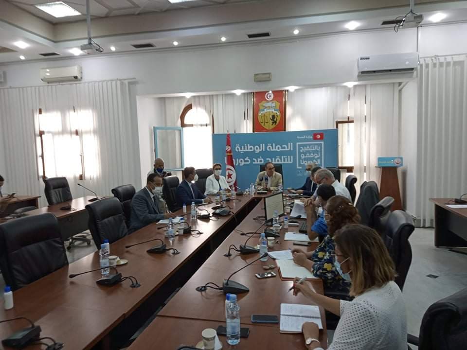 عقد وزير الصحة بالنيابة السيد محمد الطرابلسي مساء اليوم الثلاثاء 03 أوت 2021 إجتماعا بالسادة ولاة الجمهورية عبر تقنية التخاطب عن بعد، وقد خصص لتدارس السبل الكفيلة بمساهمة السلط الجهوية في دعم الجهود وإحكام التنسيق مع مختلف الأطراف المتداخلة لإنجاح اليوم الوطني للتلقيح ضد كوفيد-19 المزمع تنظيمه يوم 08 أوت الجاري بمختلف جهات البلاد.